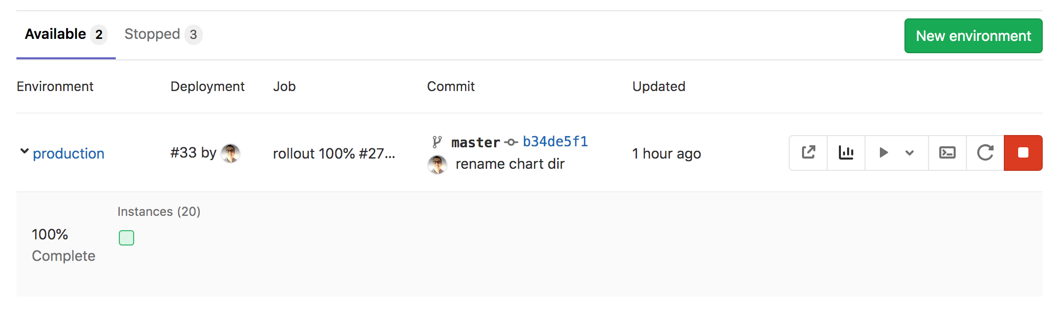 After successfully deploying your application, you can view its website and check on its health on the Environments page by navigating to Operate > Environments. This page displays details about the deployed applications, and the right-hand column displays icons that link you to common environment tasks: